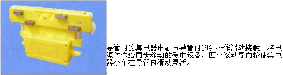 HXTS、HXTL(DHG)的導管內有裝配緊湊、移動靈活的集電器小車,在移動受電設備的拖動下,同步移動。同時通過在集電器上配置的多極電刷在導軌上滑動接觸,將導軌上電源可靠地輸給移動受電設備。