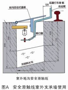 室外安全滑觸線地溝結構:垂直安裝圖A、側面安裝圖B、地溝活動蓋板,每0.5米/塊蓋合整個地溝,支架為基建時一次性建筑。